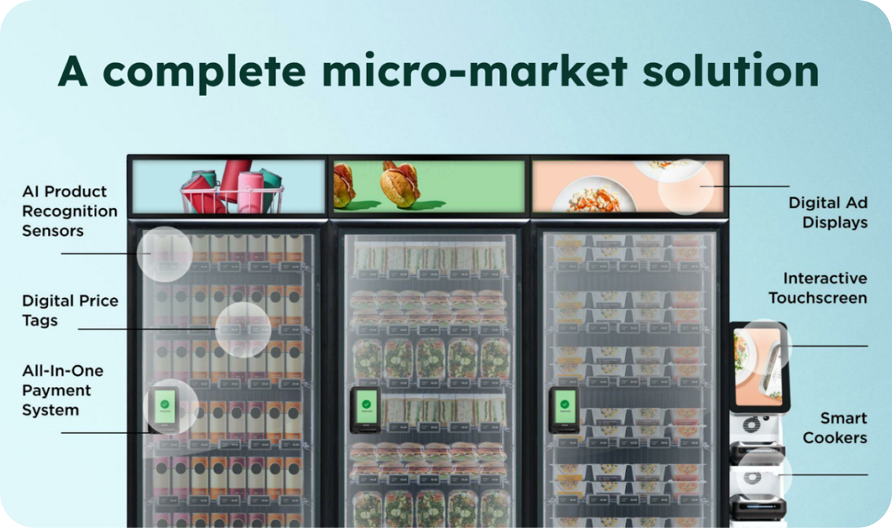 Customers unlock the Smart Store with a credit/debit card or app. AI vision tracks selected products and charges after the door closes.